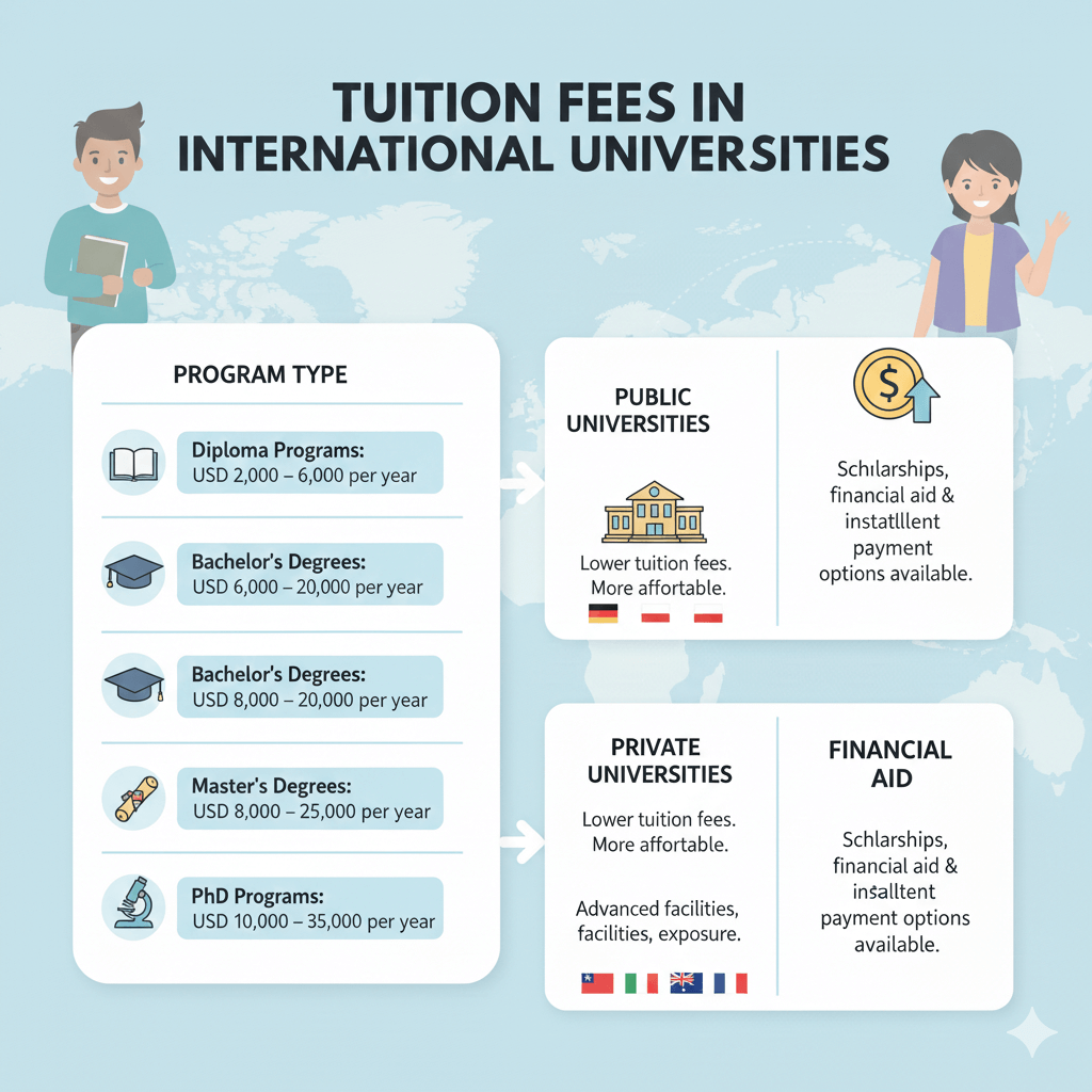 Public universities in many countries (such as Germany, Italy, or some Eastern European nations) generally have lower tuition fees and are more affordable for international students.