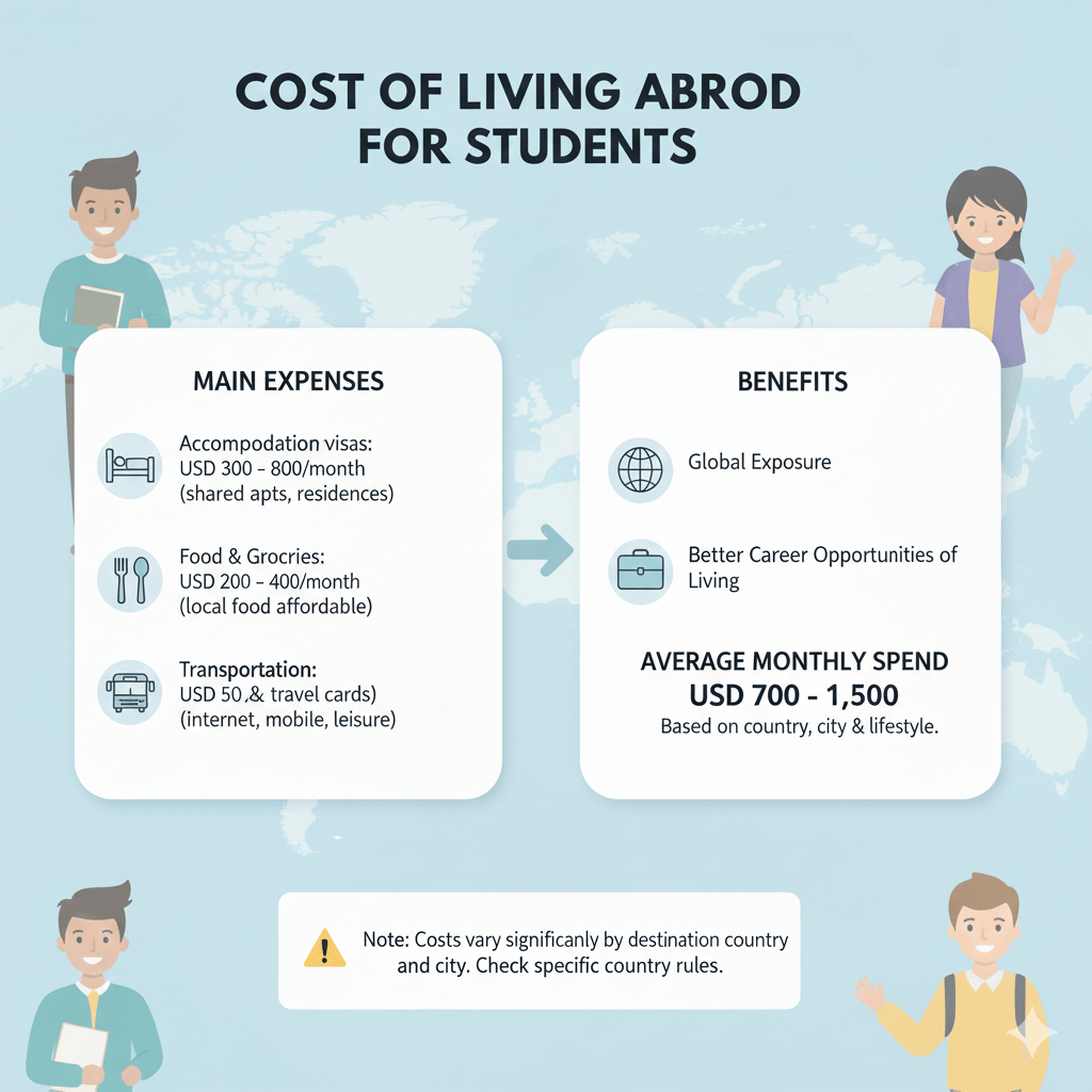On average, international students spend around USD 700 – 1,500 per month, depending on the country, city, and lifestyle. Studying abroad offers global exposure, better career opportunities, and a high standard of living, though costs vary by destination.
